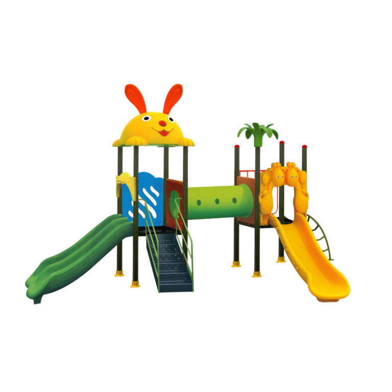 Bộ cầu trượt liên hoàn 2 khối xà đu thể chất với kích thước xác định: 4,9 x 3,5 x 3,3 m, bao gồm các chi tiết: nhà leo cầu trượt, 2 thang leo, 1 cầu trượt máng đơn nhập khẩu cùng với một số phụ kiện như vách cầu trượt, mái nhựa hình thỏ và 1 bộ xà đu thể chất…
